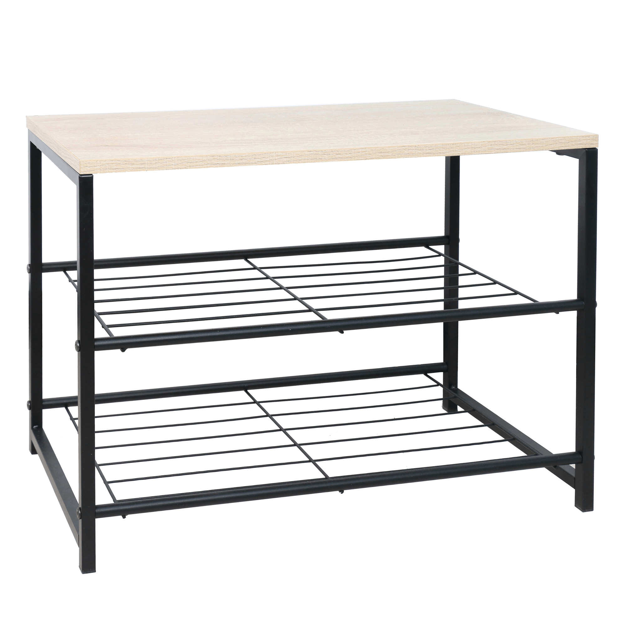 Dvojradový botník TADEO je ideálnym riešením na udržanie poriadku vo vašej predsieni. Stabilná kovová konštrukcia v čiernom prevedení je doplnená o vrchnú drevenú dosku v prírodnej farbe, ktorá poslúži ako odkladacia plocha na kabelky, kľúče či doplnky. Botník ponúka dve priestranné mriežkované police a jednu pevnú vrchnú policu, čo zaručuje praktickosť aj štýlový vzhľad.