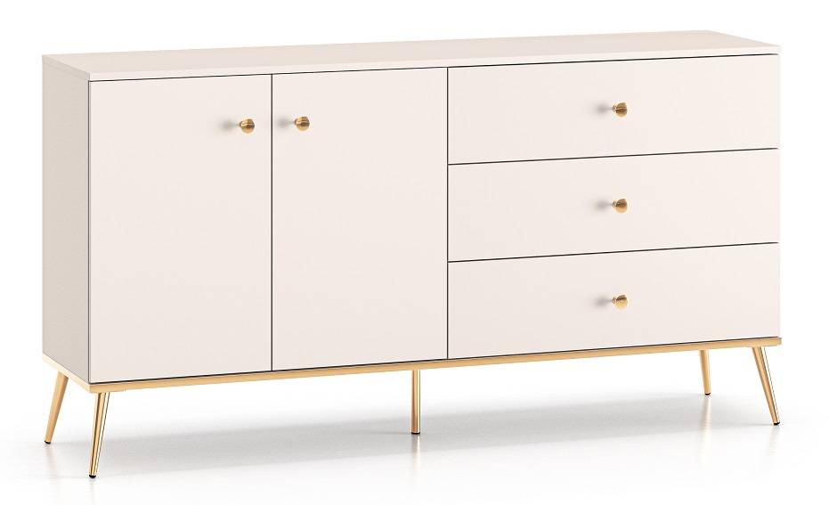 Komoda Selgin 03 spája praktickosť s nadčasovým dizajnom a prináša do interiéru poriadok aj štýl. Za dvojitými dvierkami sa nachádza polica, ideálne na uloženie textílií, dokumentov či osobných zbierok. Ďalšia časť komody obsahuje tri hlboké zásuvky so systémom plného výsuvu, vďaka ktorým sú všetky veci vždy ľahko prístupné. Vysoké kovové nožičky dodávajú konštrukcii stabilitu a ľahkosť, pričom uľahčujú upratovanie. Zlaté úchytky zvýrazňujú luxusný charakter nábytku. Spevnené dná zásuviek zaručujú vyššiu nosnosť a široká horná plocha sa výborne hodí na vystavenie obľúbených dekorácií.