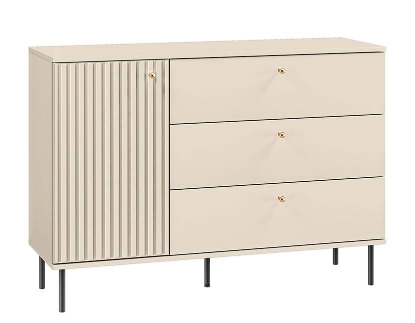 Komoda SOPHIE 05 predstavuje spojenie moderného dizajnu a vysokej funkčnosti. Trendové ryhovanie na čelných plochách je skutočným hitom tohto roka – dodáva nábytku originálny šarm a pôsobí ako jedinečný dekoratívny prvok, ktorý si získa aj náročných zákazníkov. Čierne, štíhle kovové nožičky zabezpečujú stabilitu a zároveň prinášajú do celku vzdušnosť a ľahkosť. Zlaté úchytky podčiarkujú eleganciu a dodávajú komode reprezentatívny vzhľad. Dômyselné vnútorné usporiadanie – tri zásuvky a skrinka s policou – poskytuje praktický priestor na odkladanie rozličných predmetov. Komoda je vyrobená z kvalitných materiálov, ktoré zaručujú pevnosť, odolnosť a dlhú životnosť, čo z nej robí spoľahlivý a estetický kus nábytku do každého interiéru.