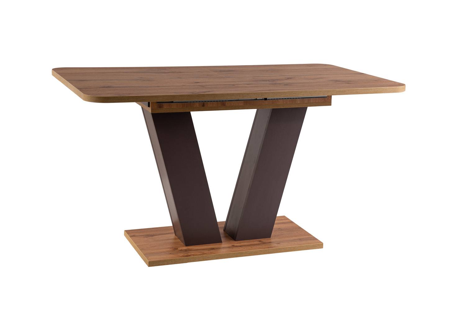 Stôl Platon je štýlový a funkčný doplnok do každej modernej jedálne či obývačky. Jeho najväčšou prednosťou je možnosť rozloženia až do 176 cm, vďaka čomu pohodlne usadí až 8 osôb. V zloženom stave zaberá menej miesta, no v prípade potreby sa ľahko prispôsobí väčšiemu počtu hostí. Vrchná doska aj podnož sú vyrobené z laminovanej drevotriesky v odtieni dub wotan, čo vytvára teplý a prirodzený vzhľad. Nohy a skrytá rozkladacia vložka majú kontrastný, matne hnedý odtieň, ktorý stolu dodáva moderný a svieži charakter.