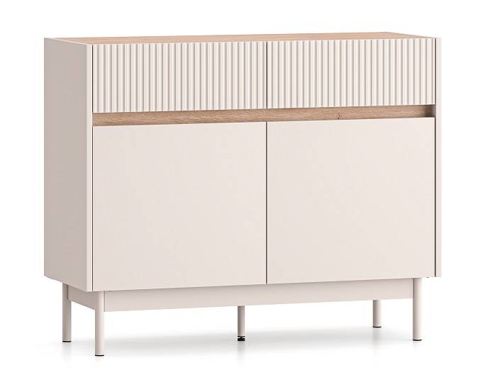 Komoda Dunea 06 prináša do interiéru moderný dizajn a jemnú eleganciu, pričom vytvára priestor, v ktorom každodenné predmety získavajú štýlovú prezentáciu. Ryhované čielka zásuviek v odtieni kašmír upúta pozornosť a zdôrazňuje jedinečný charakter nábytku. Komoda obsahuje 2 skrinky s policami a dvierkami, 2 zásuvky.