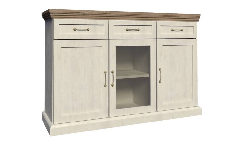 - Komoda ROYAL K1S sa skladá z troch priestranných zásuviek a troch skriniek s policami vo vnútri. Prostredná skrinka obsahuje sklo.