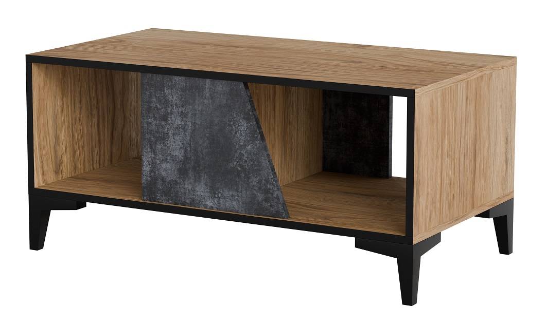 Konferenčný stolík OVO sa vyznačuje moderným dizajnom so šikmými, skosene rezanými prvkami. Kombinácia dekoru starodub a tmavého betónu mu dodáva industriálny charakter, vďaka čomu sa skvele hodí do aktuálnych interiérových trendov.