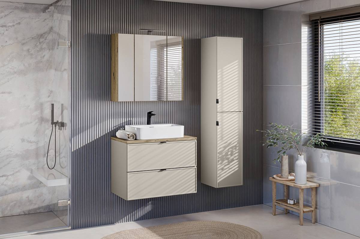 Kolekcia Bella Cashmere predstavuje dokonalé spojenie moderného štýlu a nadčasovej elegancie. Nábytok je vyhotovený v jemnom kašmírovom tóne, ktorý dodáva priestoru príjemnú a vyváženú atmosféru. Charakteristické frézované rámy na dvierkach pridávajú celému setu elegantný vzhľad. Na výber sú štýlové úchyty v troch farebných prevedeniach – zlatom lesku, chrómovom lesku a matnej čiernej. Vďaka rôznym tvarom a veľkostiam skríň pod umývadlo je kolekcia vhodná do kúpeľní akejkoľvek veľkosti. Dizajn je flexibilný a ľahko sa kombinuje s ďalšími kúskami v dekoroch Cashmere a Artisan, čo umožňuje vytvoriť jednotný a moderný interiér kúpeľne. Použitie tichých pántov a zásuviek zvyšuje komfort používania, poskytuje dostatok úložného priestoru. Nábytok je vyrobený z kvalitných a pevný materiálov ako MDF a laminované dosky, čo zabezpečuje jeho odolnosť a dlhodobé používanie. Celý dizajn je premyslený tak, aby maximálne vyhovoval potrebám aj náročných užívateľov. Každý diel kolekcie Bella Cashmere je starostlivo vyrobený s dôrazom na detail, čo zabezpečuje krásny vzhľad a dlhodobú spokojnosť s nábytkom, ktorý je navyše krytý zárukou na dva roky. Táto kolekcia je výbornou voľbou pre tých, ktorí chcú do kúpeľne štýlové a funkčné riešenie.