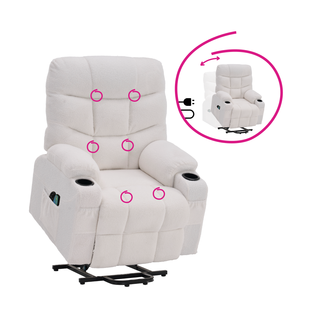 Kreslo HUDSON je ideálne na oddych po náročnom dni. Moderný dizajn kombinuje komfort s praktickými funkciami – polohovanie operadla a podnože, elektrické zdvíhanie, masážne programy a úložné priestory. Čalúnenie bielou látkou Bouclé a oceľová konštrukcia zabezpečujú odolnosť a stabilitu. Pohodlné sedenie poskytuje výplň z hustej peny 240D.
