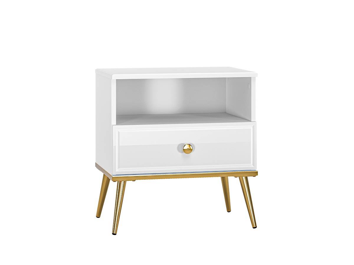 Nočný stolík GOLDIN 07 je neodmysliteľnou súčasťou každej spálne zariadenej v štýle glamour. Lesklá biela v kombinácii so zlatými detailmi vytvára elegantný a luxusný efekt, ktorý osloví aj tých najnáročnejších. Praktická zostava úložného priestoru zahŕňa zásuvku a otvorenú policu, ideálne na odkladanie kníh, liekov či iných drobností, ktoré chcete mať vždy poruke. Horná doska stolíka ponúka priestor na umiestnenie lampy, dekorácií alebo osobných doplnkov, čím dodá interiéru osobitý a štýlový charakter.