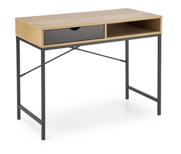 Písací stôl B-50 je moderné a funkčné riešenie, ktoré ideálne vyhovuje potrebám hráčov aj ľudí pracujúcich z domu. Vďaka kompaktným rozmerom a premyslenej konštrukcii zabezpečuje optimálnu organizáciu priestoru a zároveň pridáva eleganciu do každého interiéru. Vyrobený z laminovanej dosky s melamínovou fóliou a práškovo lakovanej ocele, stôl B-50 spája odolnosť s moderným dizajnom, vďaka čomu je perfektnou voľbou do každého súčasného priestoru. Stôl B-50 je ideálny pre tých, ktorí si cenia moderný dizajn, funkčnosť a trvácnosť. Kompaktné rozmery umožňujú jeho využitie aj v menších miestnostiach, pričom stále poskytuje dostatočnú pracovnú plochu. Pevné materiály použité na výrobu zaručujú dlhú životnosť a odolnosť proti poškodeniu, zatiaľ čo premyslená konštrukcia s praktickou zásuvkou a otvorenou poličkou umožňuje pohodlnú organizáciu priestoru. Farebné prevedenie zlatý dub v kombinácii s čiernymi prvkami dodáva stolíku elegantný a moderný vzhľad, ktorý sa hodí do rôznych štýlov interiérov. Stôl B-50 je výbornou voľbou nielen na prácu, ale aj na každodenné herné aktivity.
