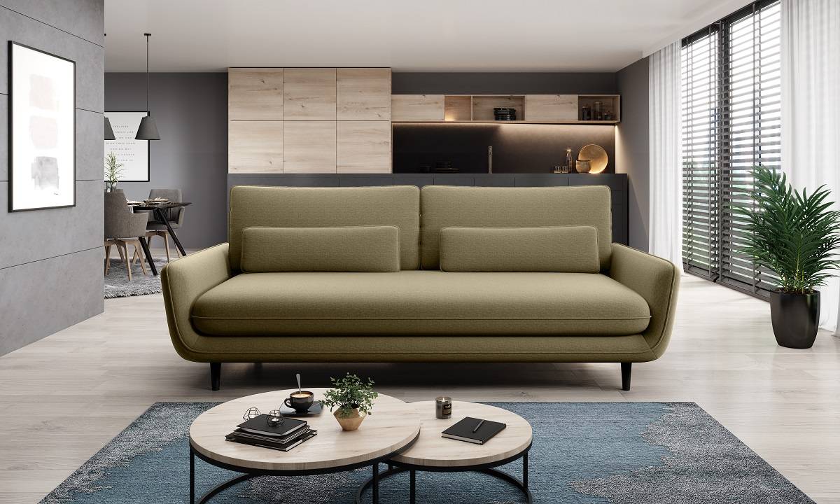 Jemné línie minimalistického štýlu a praktická funkčnosť – to sú znaky tejto pohovky. Jednoduché línie tejto pohocky sú doplnené o zaujímavé dizajnové prvky, ktoré v súhre vytvárajú perfektný model vhodný do každej modernej izby. Menšie rozmery sú vhodné aj do bytov alebo menších obývacích izieb. Sedačka je vybavená rozkladaním typu automat, vďaka ktorému pohovku premeníte v priebehu niekoľkých sekúnd na lôžko na príležitostný spánok pre Vašich hostí, alebo na pohodlné leňošenie pri sledovaní televízie. Úložný priestor sa nachádza pod sedacou časťou. Vysoké drevené nohy Vám umožnia ľahko upratať priestor pod sedačkou. Zadné odnímateľné, voľne položené vankúše Vám umožnia vytvoriť si pohodlné sedenie presne podľa svojej požiadavky.