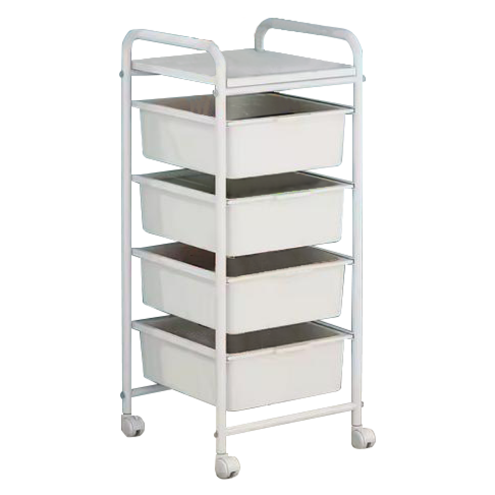 Pojazdný regál SUFIK s moderným dizajnom a praktickým úložným priestorom sa stane skvelým doplnkom vášho interiéru. Vybavený je 4 kolieskami, ktoré umožňujú jednoduché premiestnenie, pričom dve kolieska majú brzdu pre bezpečné zaistenie regálu na mieste. Regál obsahuje 4 priestranné plastové boxy, ideálne na organizáciu hračiek, kníh, časopisov alebo drobností v obývačke, spálni, kuchyni či kancelárii. Vrchná polica poskytuje priestor na odkladanie dekorácií alebo praktických predmetov každodennej potreby. Vyrobený je zo železa v kombinácii s MDF a plastom v neutrálnom bielom prevedení.