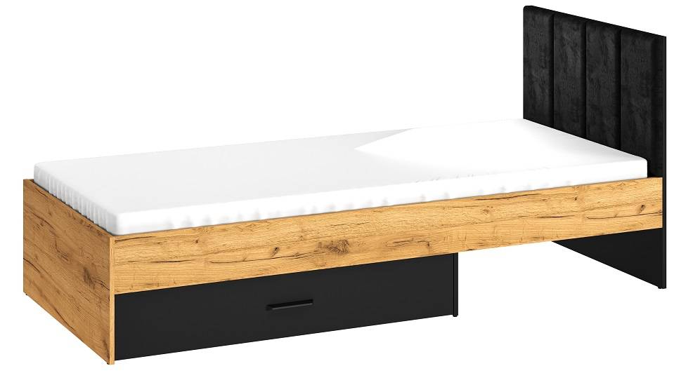 Posteľ 90x200 COLT 10 je ideálnym doplnkom do každej spálne či študentskej izby, kde spája praktickosť a estetiku v jednom. Pevný rošt zaručuje stabilitu a dlhú životnosť, pričom podčiarkuje moderný dizajn. Model je výsledkom inovatívneho prístupu k dizajnu a precízneho spracovania. Posteľ COLT 10 ponúka nielen pohodlný spánok, ale aj praktické riešenia pre úložný priestor – zásuvka umiestnená pod lôžkom je ideálna na odkladanie osobných vecí. Elegantné čalúnené čelo potiahnuté zamatovou látkou VELVET poskytuje komfort pri relaxe a pôsobí štýlovo. Tento model vnáša do interiéru nadčasový charakter, ktorý sa hodí k rôznym štýlom zariadenia. Posteľ COLT 10 sa tak stáva nielen miestom na spanie, ale aj dominantným prvkom izby, ktorý dodá priestoru šmrnc, originalitu a modernú eleganciu.