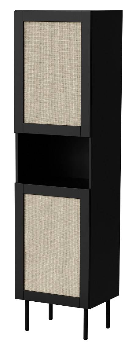 Hľadáte vitrínu, ktorá krásne doplní rustikálnu obývačku? Našou odporúčanou voľbou je vitrína JUTA. Jej čierny korpus v kombinácii s ratanovými čelami príjemne zútulní interiér a dodá mu jedinečný vzhľad.