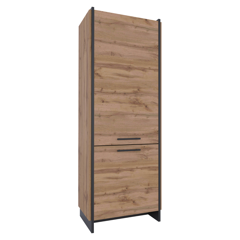 Sektorový systém AMONI v kombinácii dub wotan a čierna predstavuje moderné a praktické riešenie pre váš interiér. Spojenie prírodného dekoru s čiernou farbou prináša do každej miestnosti nádych štýlu a elegancie. Na jednotlivých druhoch nábytku sa nachádzajú kovové úchytky v čiernom farebnom prevedení. Korpus boku je vyrobený z dvojitej laminovanej DTD, ktorá určuje charakter celej kolekcie AMONI. Samozrejmosťou sú ABS hrany, ktoré chránia hrany nábytku pred poškriabaním a mechanickým poškodením. Komponenty sa objednávajú jednotlivo, vďaka čomu si môžete vytvoriť zostavu podľa vašich predstáv. Dvojdverový regál 2D AMONI poskytuje úložný priestor v podobe políc, ktoré sa ukrývajú za dvierkami.