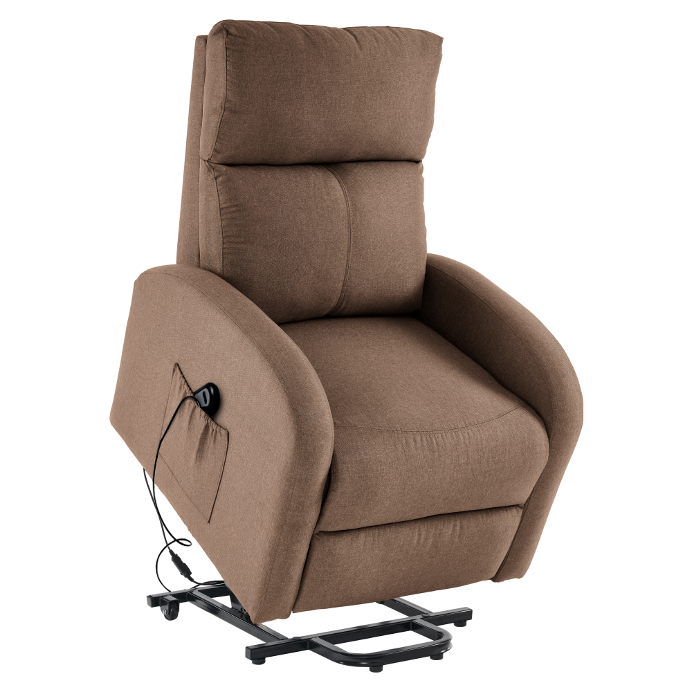 Kreslo NERIS je ideálne na oddych po náročnom dni. Moderný a nadčasový dizajn kombinuje pohodlie s praktickými funkciami – elektrické zdvíhanie, polohovanie operadla a podnože, a úložný priestor v bočnom vrecku. Čalúnenie svetlohnedou látkou a oceľová konštrukcia zabezpečujú odolnosť a stabilitu. Pohodlné sedenie poskytuje výplň z hustej peny 240D.
