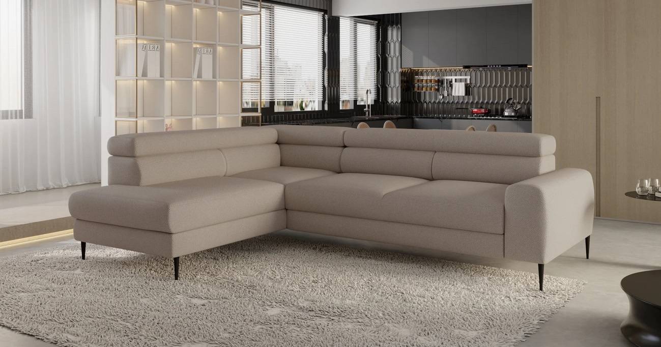Tento moderný model rohovej sedacej súpravy  v sebe ukrýva rozkladanie typu delfín, vďaka ktorému môžete sedaciu súprava v priebehu niekoľkých sekúnd premeniť na príležitostné miesto na spanie. Úložný priestor sa nachádza v otomane sedacej súpravy. Výškovo nastaviteľné opierky hlavy Vám umožnia nastaviť si miesto na oddych alebo na sledovanie televízie presne podľa svojich požiadaviek. Vysoké čierne nohy Vám dovolia udržiavať priestor pod sedačkou vždy čistý as uprataný.