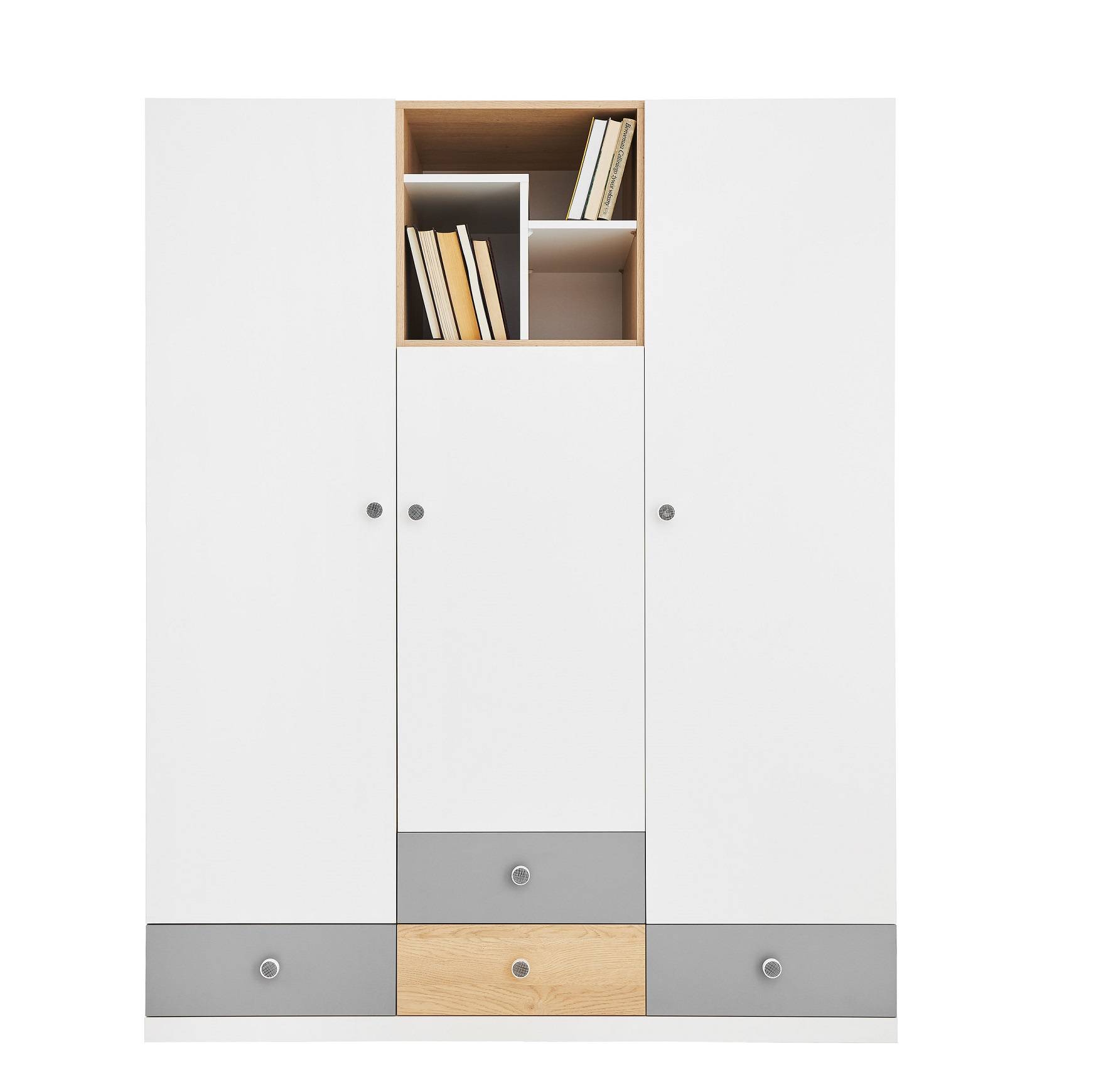 Hľadáš skriňu, ktorá dodá tvojmu interiéru moderný dizajn a zároveň poskytne množstvo úložného priestoru? Mládežnícka skriňa Pixel 1 so zásuvkami (šírka 150 cm) v dekore dub biszkoptový / biela lux / sivá je ideálnou voľbou! Elegantná kombinácia odtieňov dub biszkoptový, biela lux a sivá robí zo skrine nielen praktický kus nábytku, ale aj štýlový doplnok izby. Vďaka tomu sa stane výrazným prvkom tvojho interiéru. Skriňa je vyrobená z laminovanej drevotriesky, ktorá je odolná a trvácna. Ponúka až 9 políc, 4 zásuvky a tyč na vešanie oblečenia, čo zaručuje veľa miesta na uskladnenie šiat aj doplnkov. Pohodlné otváranie zásuviek s úchytkami zjednodušuje každodenné používanie. Pixel 1 sa výborne hodí do moderných mládežníckych izieb a vďaka univerzálnej farebnosti sa ľahko kombinuje s ďalším nábytkom.