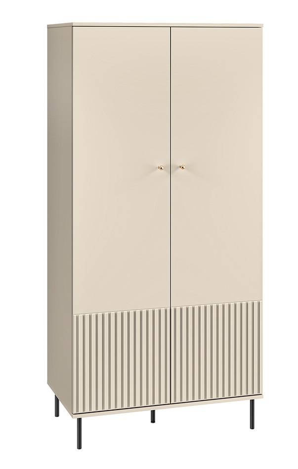 Skriňa SOPHIE 01 spája moderný štýl s nádychom elegancie. Jej originálny dizajn okamžite upúta pozornosť a dodá priestoru výnimočný charakter. Predstavuje ideálne riešenie pre tých, ktorí hľadajú praktický úložný priestor a zároveň chcú, aby nábytok pôsobil esteticky a reprezentatívne. Predná časť skrine je ozdobená jemným ryhovaním, ktoré jej dodáva sofistikovaný a subtílny vzhľad. Tieto detailne spracované línie vytvárajú zaujímavý kontrast a podčiarkujú jedinečnosť nábytku. Čierne kovové nožičky zabezpečujú stabilitu a zároveň opticky odľahčujú celú konštrukciu. V kombinácii so svetlým dekorom pôsobia moderne a dynamicky. Zlaté úchyty nielen uľahčujú používanie, ale zároveň dodávajú luxusný nádych a zvýrazňujú precízne spracovanie. Táto dvojdverová skriňa je nielen praktickým riešením na odkladanie oblečenia, ale aj elegantným doplnkom, ktorý pozdvihne vzhľad každého interiéru.